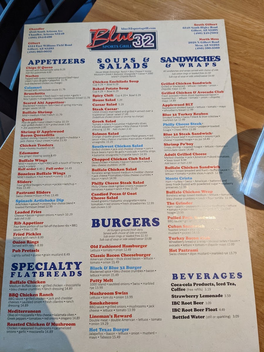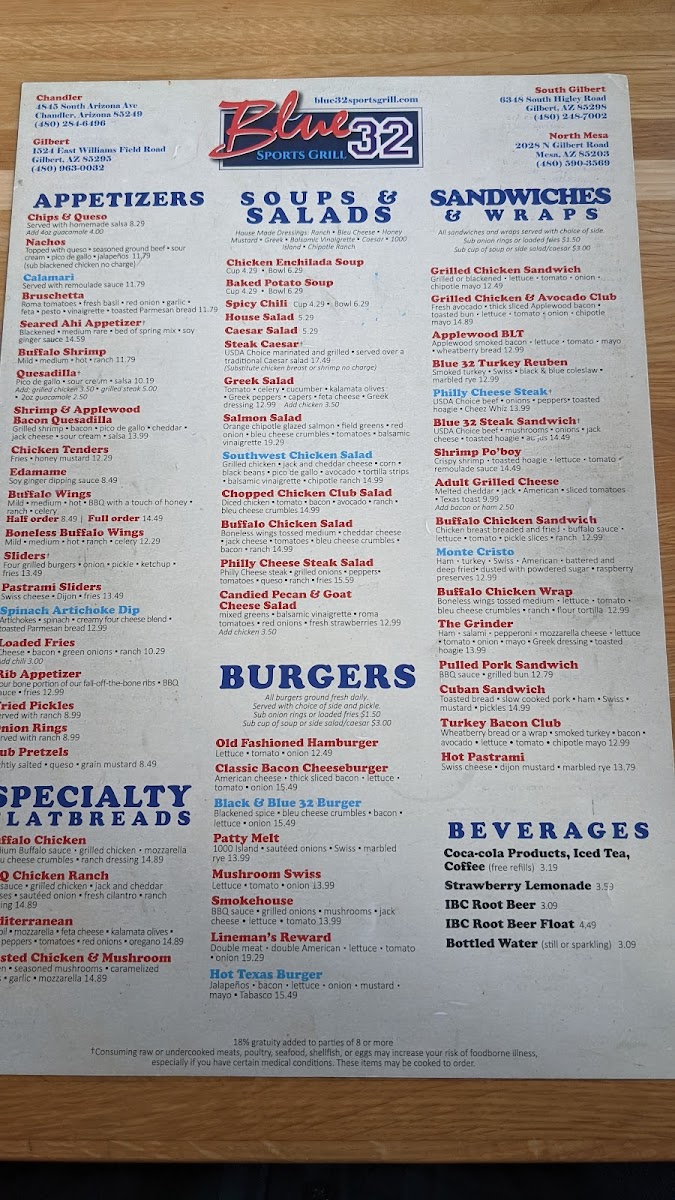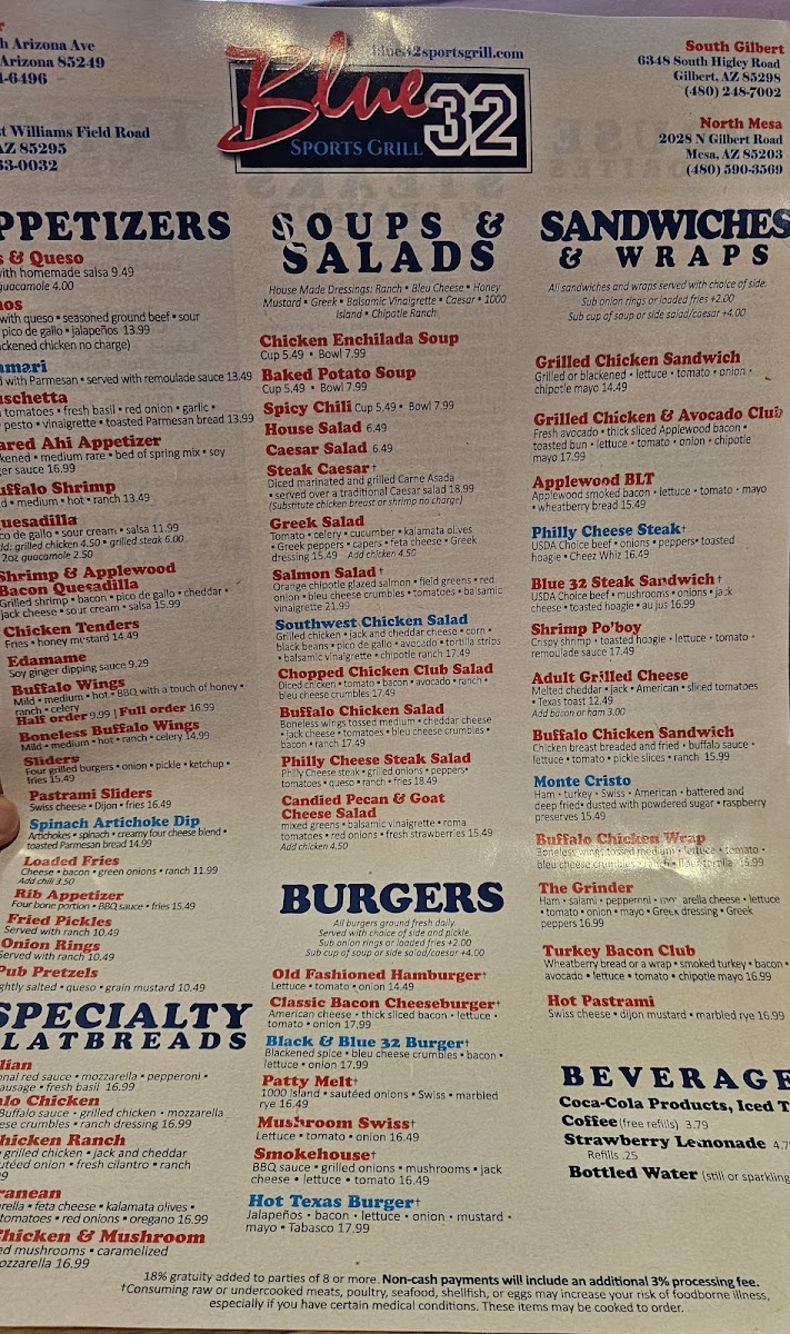 Welcome to Blue 32 Sports Grill, the quintessential sports bar located in Gilbert, Arizona. Here, food and sports come alive in a vibrant atmosphere, making it the perfect spot for game day excitement. Their menu shines with a variety of all-day options, from the flavorful Blackened Chicken Alfredo to the tender Babyback Ribs, renowned for meat that simply falls off the bone.